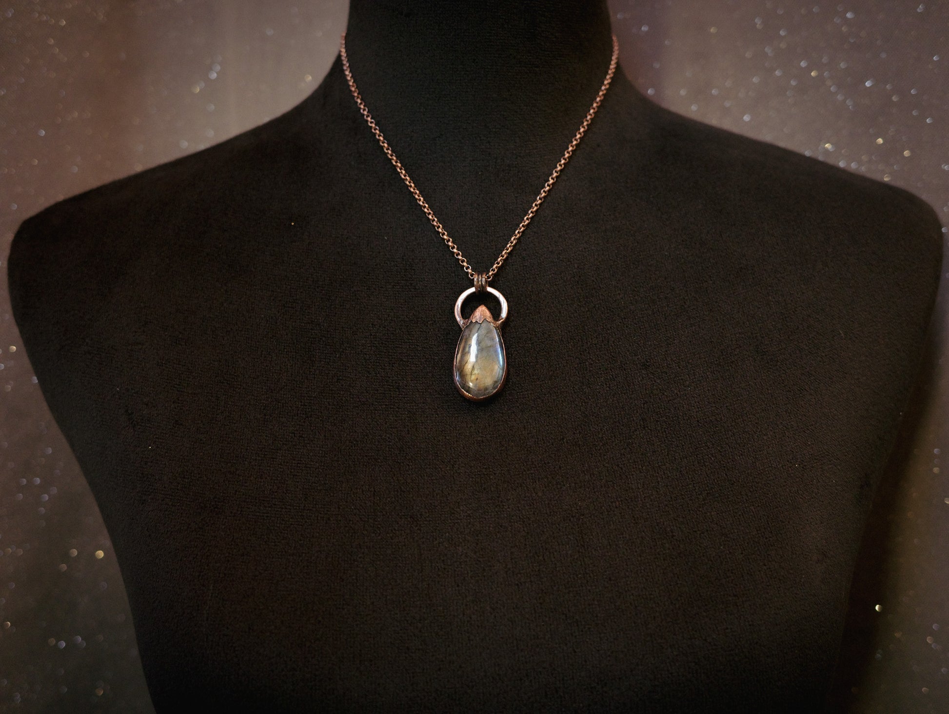 Labradorite electroformed copper pendant. Hanging from a 16in antique style steel chain.